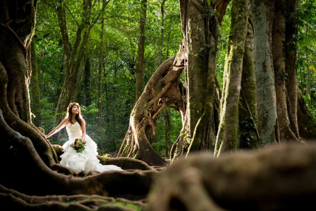 木漏れ日が作る陰影や、少し湿った森の雰囲気、そしてドレス・タキシード姿の花嫁花婿の姿…!